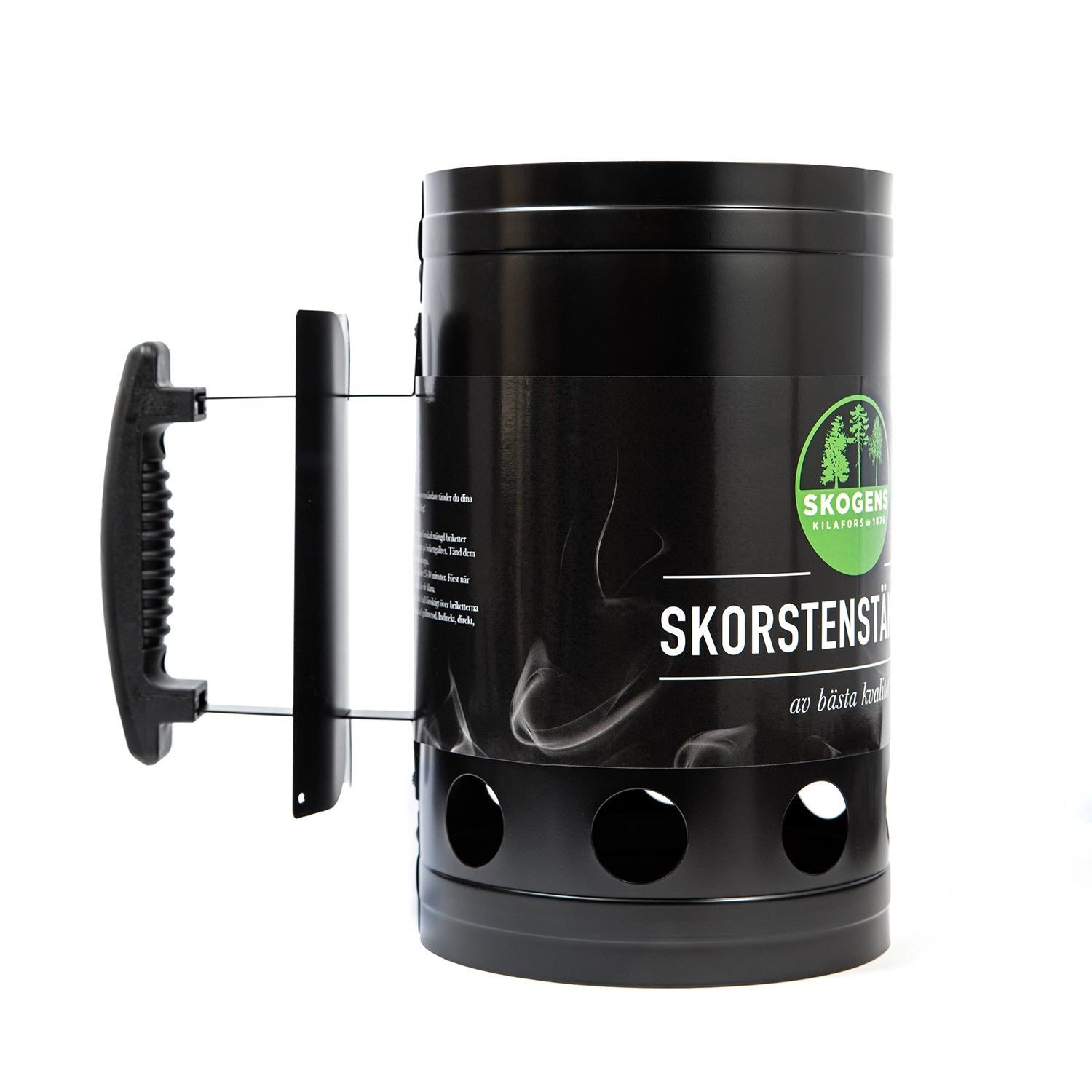 Med Skogens kvalitativa skorstenständare tänder du dina grillbriketter och grillkol enkelt och miljövänligt. Fyll skorstenständarens med kol eller briketter. Placera och tänd 2–3 tändkuber/träull i nedre delen av grillen och placera skorstenständaren över. Vänta tills kolet/briketterna är täckta av grå/vit aska. Nu är det dags att hälla ut kolet/briketterna ner i grillen. Sätt på det översta grillgallret och på med locket för att gallret ska hinna bli varmt – börja grilla!